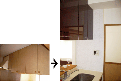 こちらもキッチンのリフォームの事例です。 キッチンの扉と床、壁をリフォームしました。色調を明るくしたことで、モダンで明るい雰囲気になりました。 |